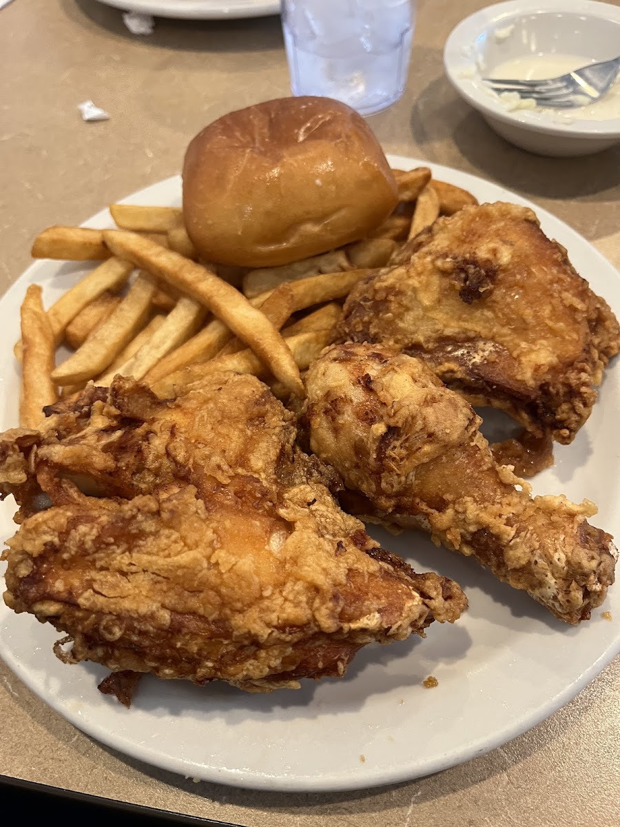 Stopped in because of the reviews. Service was good. Atmosphere good. Two piece white broasted with onion rings and mashed potatoes. Potatoes were definitely from a mix, had that mix flavor. Chicken was served hot. However it was chewy. Onion rings were excellent. Root beer fountain drink wasn't mixed well and kinda flavorless. Had hope it would be better.