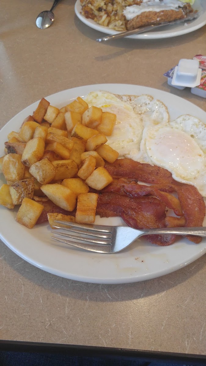 Spacious restaurant, nice clean menu. Great selection of American food. Nice Philly Sandwich, nice pancake, hot chocolate. Coffee could be stronger. Nice fries. Yummy bacon and eggs.